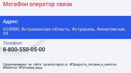 МегаФон, оператор связи по адресу 414000, Астраханская область, Астрахань, Ахматовская, 14 в дальнейшем Организация, размещена в следующих категориях: