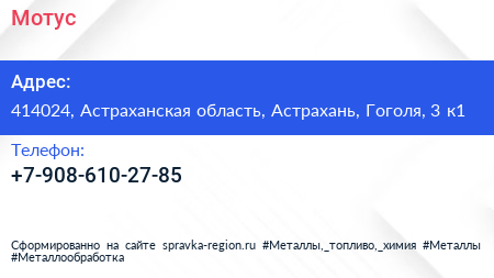 Мотус по адресу 414024, Астраханская область, Астрахань, Гоголя, 3 к1 в дальнейшем Организация, размещена в следующих категориях: