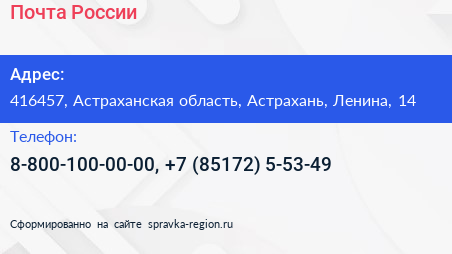 Почта России по адресу 416457, Астраханская область, Астрахань, Ленина, 14 в дальнейшем Организация, размещена в следующих категориях: