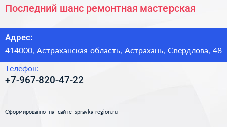 Последний шанс, ремонтная мастерская по адресу 414000, Астраханская область, Астрахань, Свердлова, 48 в дальнейшем Организация, размещена в следующих категориях: