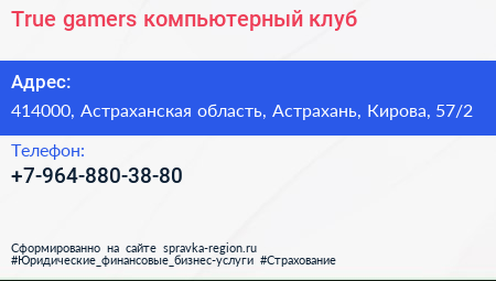True gamers, компьютерный клуб по адресу 414000, Астраханская область, Астрахань, Кирова, 57/2 в дальнейшем Организация, размещена в следующих категориях: