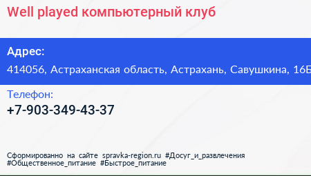Well played, компьютерный клуб по адресу 414056, Астраханская область, Астрахань, Савушкина, 16Б в дальнейшем Организация, размещена в следующих категориях: