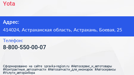 Yota по адресу 414024, Астраханская область, Астрахань, Боевая, 25 в дальнейшем Организация, размещена в следующих категориях: