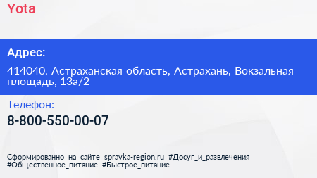 Yota по адресу 414040, Астраханская область, Астрахань, Вокзальная площадь, 13а/2 в дальнейшем Организация, размещена в следующих категориях: