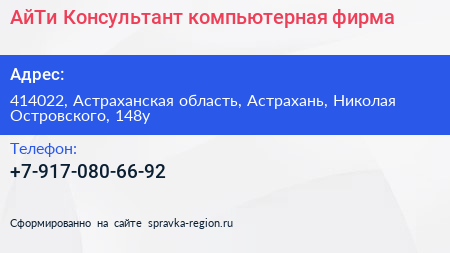 АйТи-Консультант, компьютерная фирма по адресу 414022, Астраханская область, Астрахань, Николая Островского, 148у в дальнейшем Организация, размещена в следующих категориях: