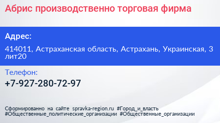 Абрис, производственно-торговая фирма по адресу 414011, Астраханская область, Астрахань, Украинская, 3 лит20 в дальнейшем Организация, размещена в следующих категориях: