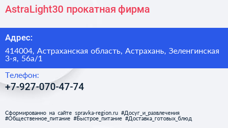 AstraLight30, прокатная фирма по адресу 414004, Астраханская область, Астрахань, Зеленгинская 3-я, 56а/1 в дальнейшем Организация, размещена в следующих категориях: