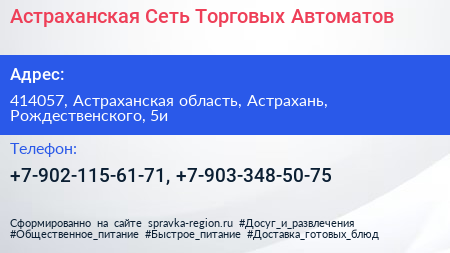 Астраханская Сеть Торговых Автоматов по адресу 414057, Астраханская область, Астрахань, Рождественского, 5и в дальнейшем Организация, размещена в следующих категориях: