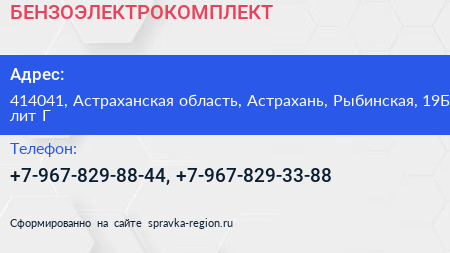 БЕНЗОЭЛЕКТРОКОМПЛЕКТ по адресу 414041, Астраханская область, Астрахань, Рыбинская, 19Б лит Г в дальнейшем Организация, размещена в следующих категориях: