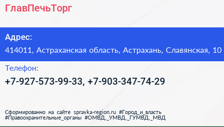 ГлавПечьТорг по адресу 414011, Астраханская область, Астрахань, Славянская, 10 в дальнейшем Организация, размещена в следующих категориях: