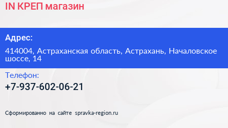 IN-КРЕП, магазин по адресу 414004, Астраханская область, Астрахань, Началовское шоссе, 14 в дальнейшем Организация, размещена в следующих категориях: