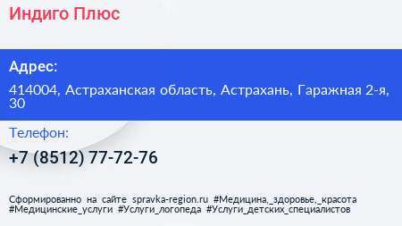 Индиго Плюс по адресу 414004, Астраханская область, Астрахань, Гаражная 2-я, 30 в дальнейшем Организация, размещена в следующих категориях: