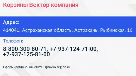Корзины Вектор, компания по адресу 414041, Астраханская область, Астрахань, Рыбинская, 16 в дальнейшем Организация, размещена в следующих категориях: