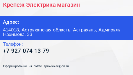 Крепеж-Электрика, магазин по адресу 414018, Астраханская область, Астрахань, Адмирала Нахимова, 33 в дальнейшем Организация, размещена в следующих категориях: