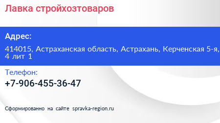 Лавка стройхозтоваров по адресу 414015, Астраханская область, Астрахань, Керченская 5-я, 4 лит 1 в дальнейшем Организация, размещена в следующих категориях: