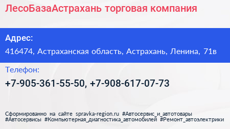 ЛесоБазаАстрахань, торговая компания по адресу 416474, Астраханская область, Астрахань, Ленина, 71в в дальнейшем Организация, размещена в следующих категориях: