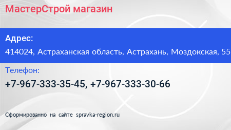 МастерСтрой, магазин по адресу 414024, Астраханская область, Астрахань, Моздокская, 55 в дальнейшем Организация, размещена в следующих категориях: