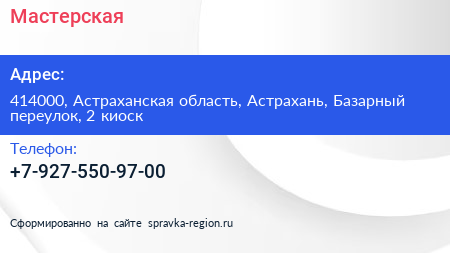 Мастерская по адресу 414000, Астраханская область, Астрахань, Базарный переулок, 2 киоск в дальнейшем Организация, размещена в следующих категориях: