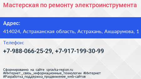 Мастерская по ремонту электроинструмента по адресу 414024, Астраханская область, Астрахань, Ахшарумова, 1 в дальнейшем Организация, размещена в следующих категориях: