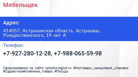 Мебельщек по адресу 414057, Астраханская область, Астрахань, Рождественского, 19 лит А в дальнейшем Организация, размещена в следующих категориях: