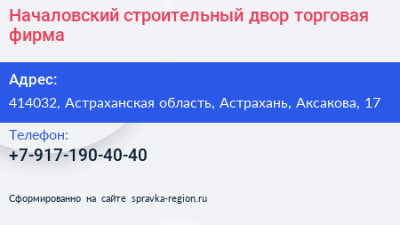 Началовский строительный двор, торговая фирма по адресу 414032, Астраханская область, Астрахань, Аксакова, 17 в дальнейшем Организация, размещена в следующих категориях: