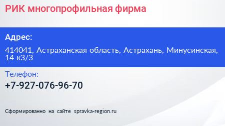 РИК, многопрофильная фирма по адресу 414041, Астраханская область, Астрахань, Минусинская, 14 к3/3 в дальнейшем Организация, размещена в следующих категориях: