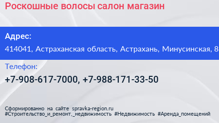 Роскошные волосы, салон-магазин по адресу 414041, Астраханская область, Астрахань, Минусинская, 8 в дальнейшем Организация, размещена в следующих категориях: