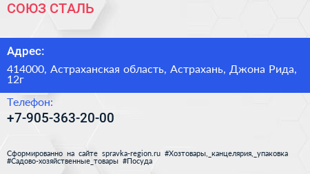 СОЮЗ СТАЛЬ по адресу 414000, Астраханская область, Астрахань, Джона Рида, 12г в дальнейшем Организация, размещена в следующих категориях: