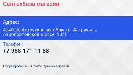 Сантехбаза, магазин по адресу 414018, Астраханская область, Астрахань, Аэропортовское шоссе, 13/1 в дальнейшем Организация, размещена в следующих категориях: