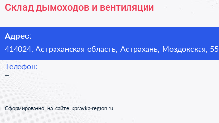 Склад дымоходов и вентиляции по адресу 414024, Астраханская область, Астрахань, Моздокская, 55 в дальнейшем Организация, размещена в следующих категориях: