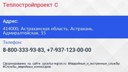 Теплостройпроект-С по адресу 414000, Астраханская область, Астрахань, Адмиралтейская, 15 в дальнейшем Организация, размещена в следующих категориях: