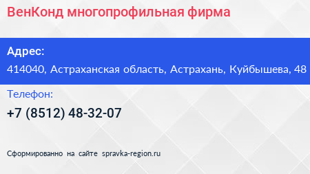 ВенКонд, многопрофильная фирма по адресу 414040, Астраханская область, Астрахань, Куйбышева, 48 в дальнейшем Организация, размещена в следующих категориях: