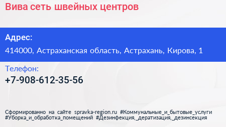 Вива, сеть швейных центров по адресу 414000, Астраханская область, Астрахань, Кирова, 1 в дальнейшем Организация, размещена в следующих категориях: