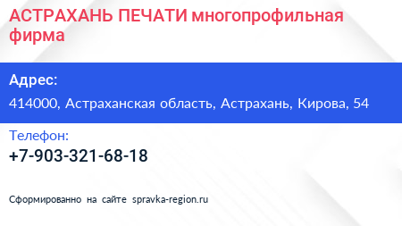 АСТРАХАНЬ-ПЕЧАТИ, многопрофильная фирма по адресу 414000, Астраханская область, Астрахань, Кирова, 54 в дальнейшем Организация, размещена в следующих категориях:
