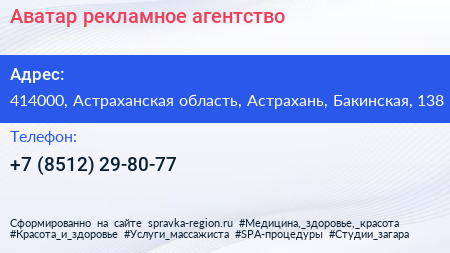 Аватар, рекламное агентство по адресу 414000, Астраханская область, Астрахань, Бакинская, 138 в дальнейшем Организация, размещена в следующих категориях: