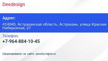 Deedesign по адресу 414040, Астраханская область, Астрахань, улица Красная Набережная, 27 в дальнейшем Организация, размещена в следующих категориях: