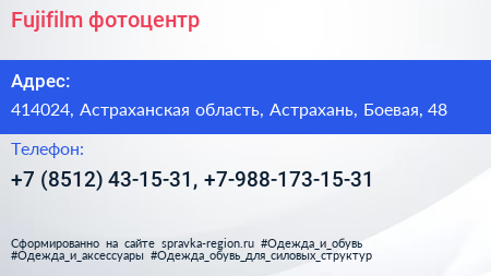 Fujifilm, фотоцентр по адресу 414024, Астраханская область, Астрахань, Боевая, 48 в дальнейшем Организация, размещена в следующих категориях: