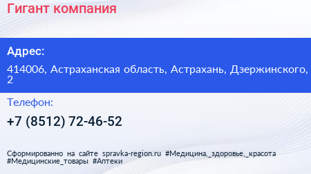 Гигант, компания по адресу 414006, Астраханская область, Астрахань, Дзержинского, 2 в дальнейшем Организация, размещена в следующих категориях: