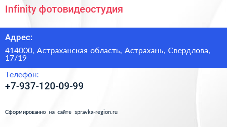Infinity, фотовидеостудия по адресу 414000, Астраханская область, Астрахань, Свердлова, 17/19 в дальнейшем Организация, размещена в следующих категориях: