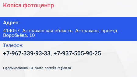 Konica, фотоцентр по адресу 414057, Астраханская область, Астрахань, проезд Воробьёва, 10 в дальнейшем Организация, размещена в следующих категориях: