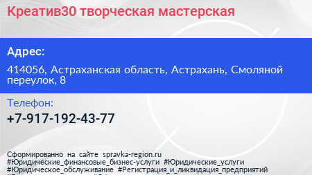 Креатив30, творческая мастерская по адресу 414056, Астраханская область, Астрахань, Смоляной переулок, 8 в дальнейшем Организация, размещена в следующих категориях: