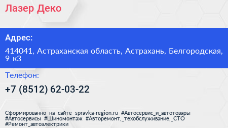 Лазер Деко по адресу 414041, Астраханская область, Астрахань, Белгородская, 9 к3 в дальнейшем Организация, размещена в следующих категориях: