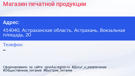 Магазин печатной продукции по адресу 414040, Астраханская область, Астрахань, Вокзальная площадь, 20 в дальнейшем Организация, размещена в следующих категориях: