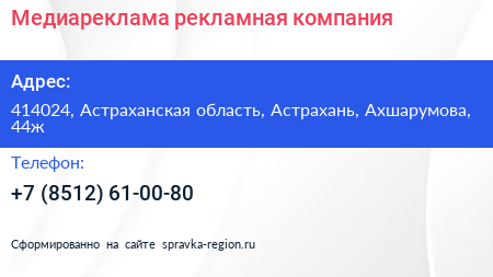 Медиареклама, рекламная компания по адресу 414024, Астраханская область, Астрахань, Ахшарумова, 44ж в дальнейшем Организация, размещена в следующих категориях: