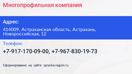Многопрофильная компания по адресу 414009, Астраханская область, Астрахань, Новороссийская, 12 в дальнейшем Организация, размещена в следующих категориях: