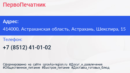ПервоПечатник по адресу 414000, Астраханская область, Астрахань, Шекспира, 15 в дальнейшем Организация, размещена в следующих категориях: