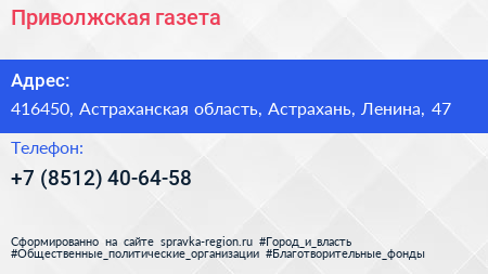 Приволжская газета по адресу 416450, Астраханская область, Астрахань, Ленина, 47 в дальнейшем Организация, размещена в следующих категориях: