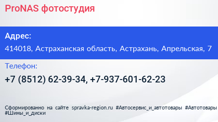 ProNAS, фотостудия по адресу 414018, Астраханская область, Астрахань, Апрельская, 7 в дальнейшем Организация, размещена в следующих категориях: