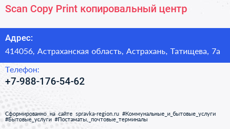 Scan. Copy. Print., копировальный центр по адресу 414056, Астраханская область, Астрахань, Татищева, 7а в дальнейшем Организация, размещена в следующих категориях: