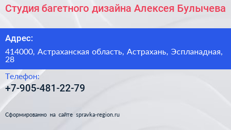 Студия багетного дизайна Алексея Булычева по адресу 414000, Астраханская область, Астрахань, Эспланадная, 28 в дальнейшем Организация, размещена в следующих категориях: